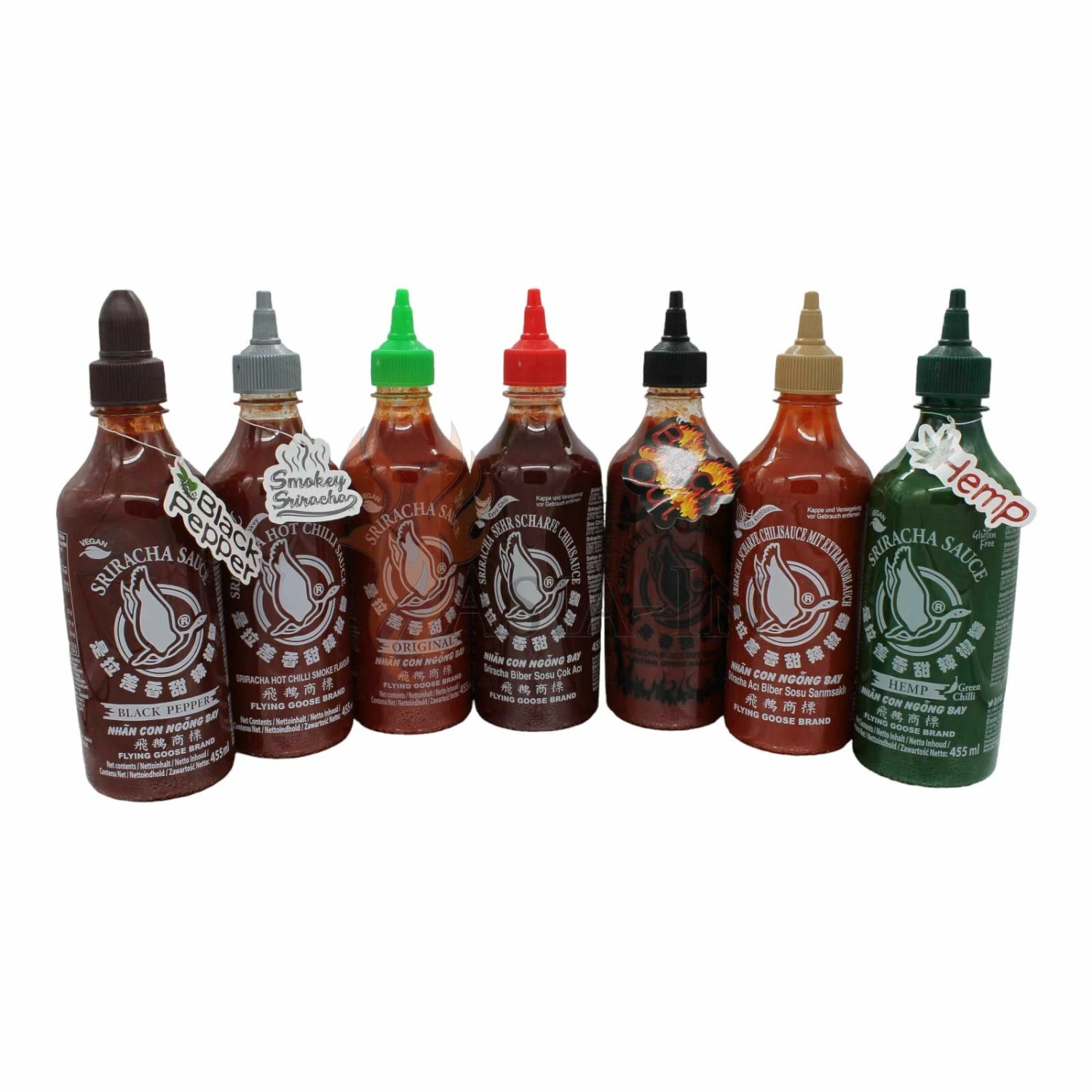 7er Set Flying Goose Sriracha Chilisauce Versch. Sorten 455ml, 3,185l