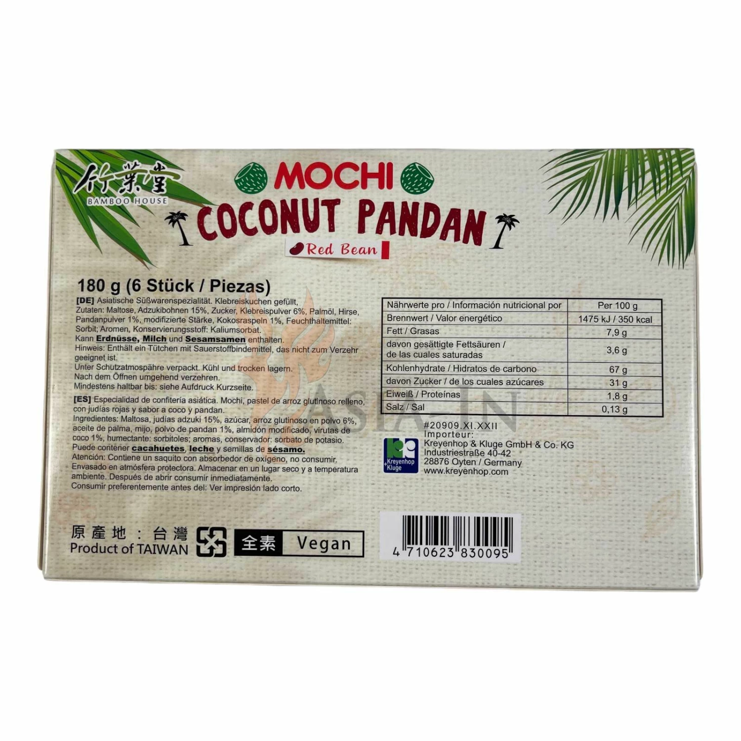| Zutaten: | Maltose, Adzukibohnen, 15%, Zucker, Klebreispulver, 6%, Palmöl, Hirse, Pandanpulver, 1%, Modifizierte Stärke, Kokosraspeln, 1%, Sorbit E420, Aroma, Konservierungsstoff: Kaliumsorbat E202 |