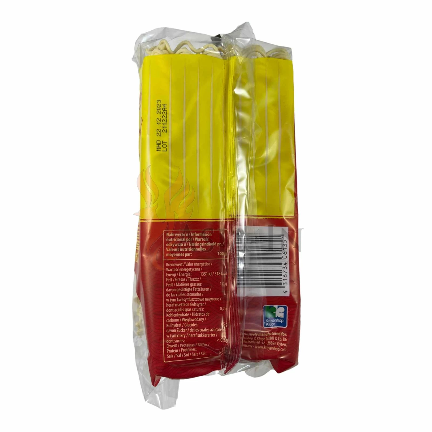 | Zutaten: | Weizenmehl, Hartweizenmehl, Wasser, Salz, Stabilisator: Polyphosphate E452, Verdickungsmittel: Xanthan E415, Backtriebmittel: Natriumcarbonate E500 |
