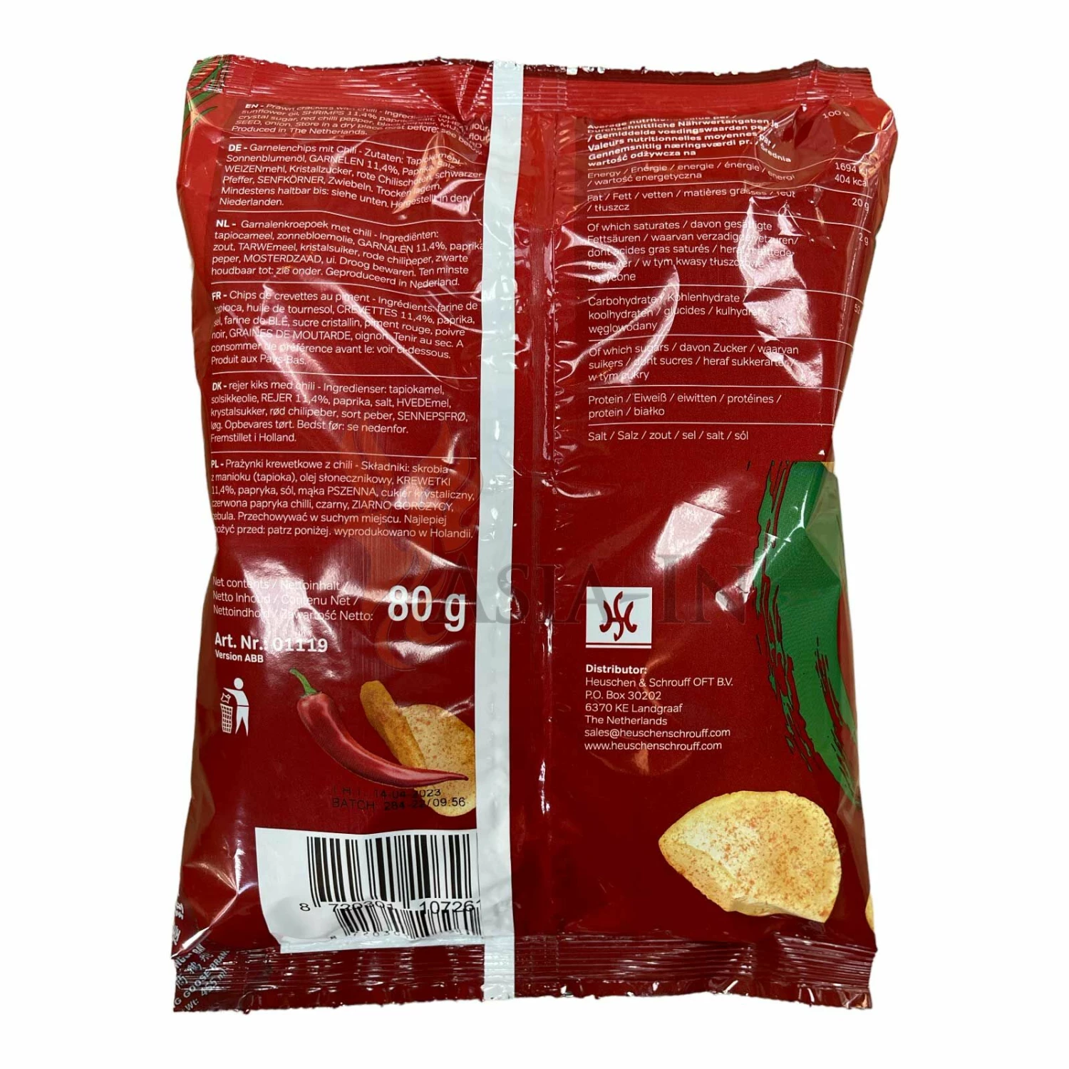 | Zutaten: | Tapiokamehl, Sonnenblumenöl, Garnelen, 11,4%, Paprika, Salz, Weizenmehl, Kristallzucker, rote Chilischoten, schwarzer Pfeffer, Senfkörner, Zwiebeln |
