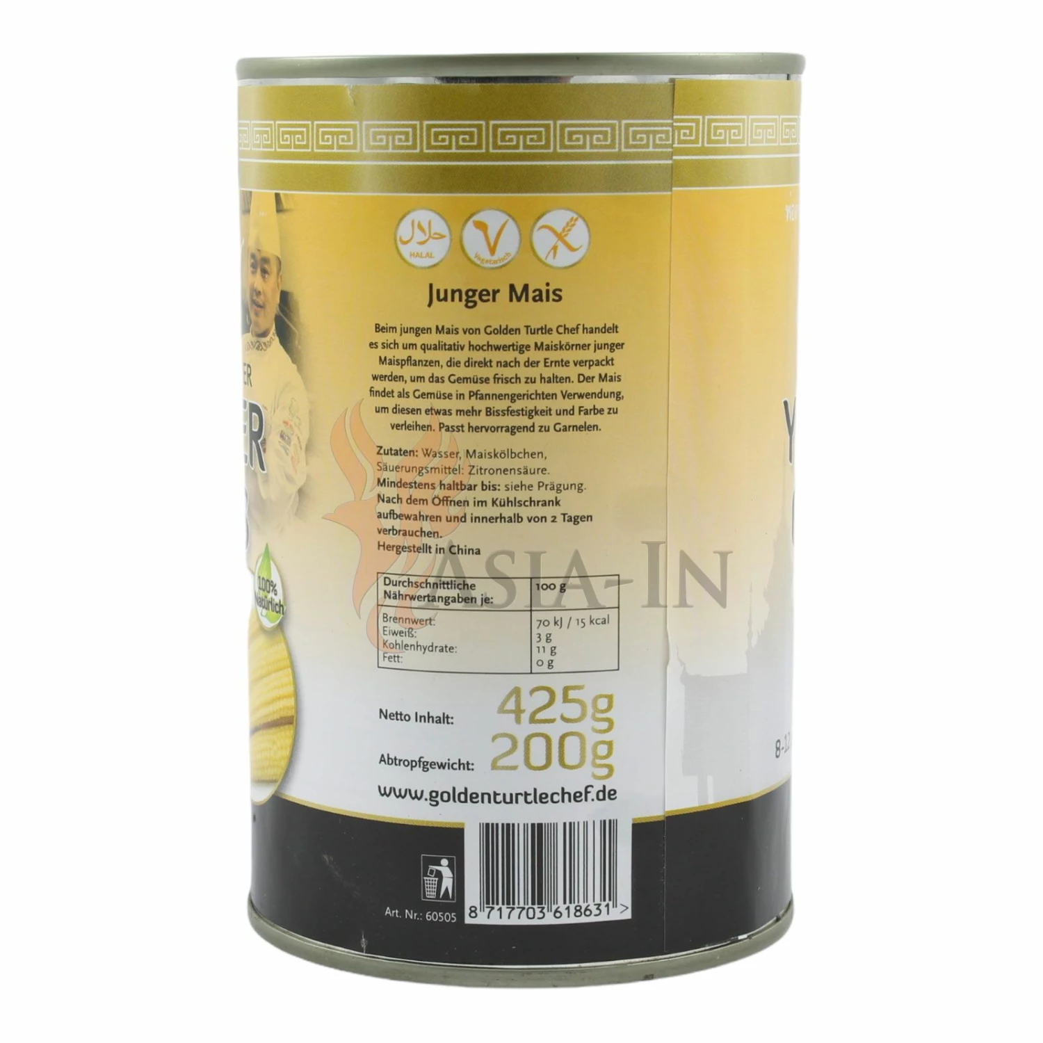 Bei jungem Mais von Golden Turtle handelt es sich um qualitativ hochwertige Maiskörner junger Maispflanzen, die direkt nach der Ernte verpackt werden, um das Gemüse frisch zu halten. Der Mais findet als Gemüse in Pfannengerichten Verwendung, um diesen etwas mehr Bissfertigkeit und Farbe zu verleihen. Passt hervorragend zu Garnelen.