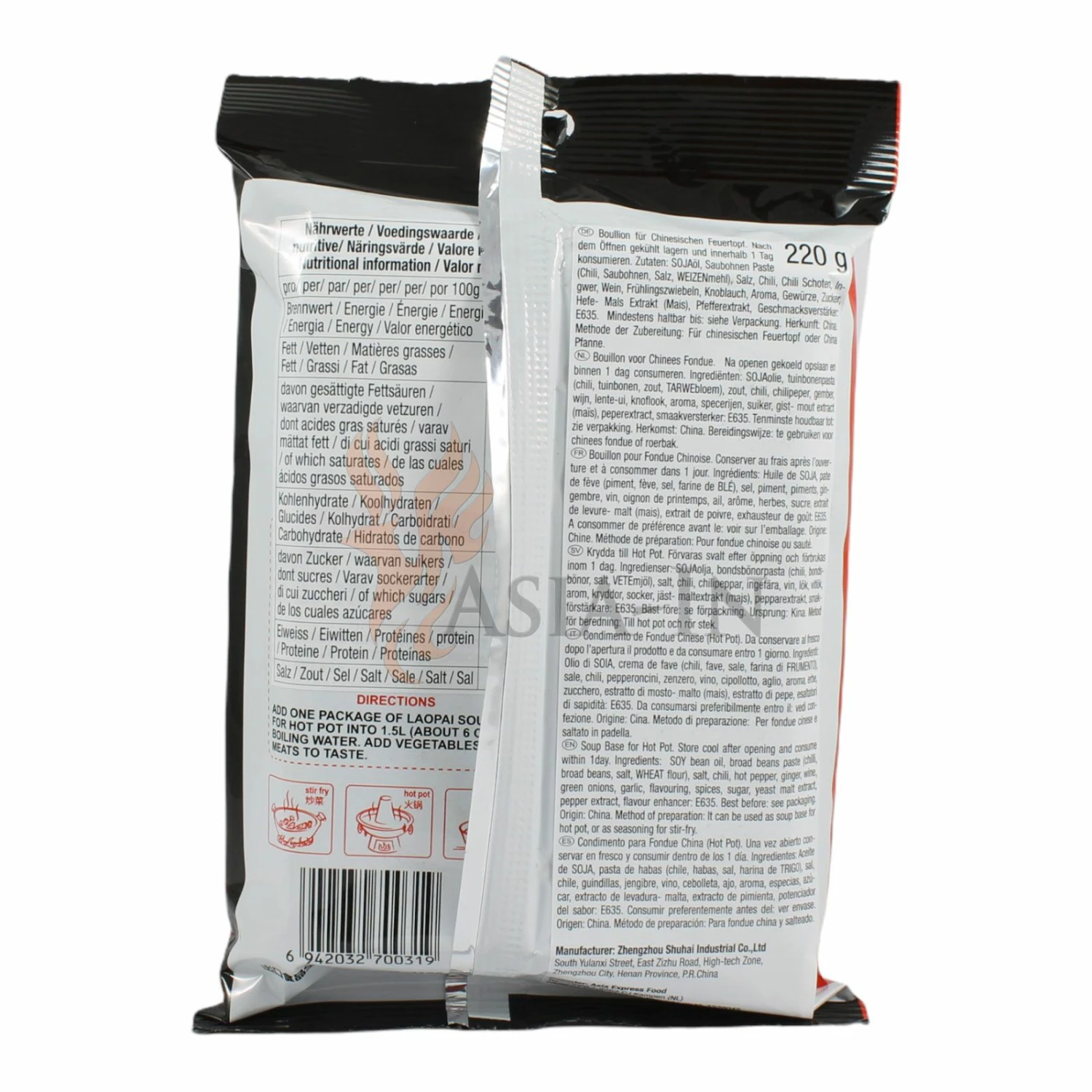| Gebrauchshinweis: | Eine Packung Laopai Suppenpaste mit 1,5l kochendem Wasser vermischen. |