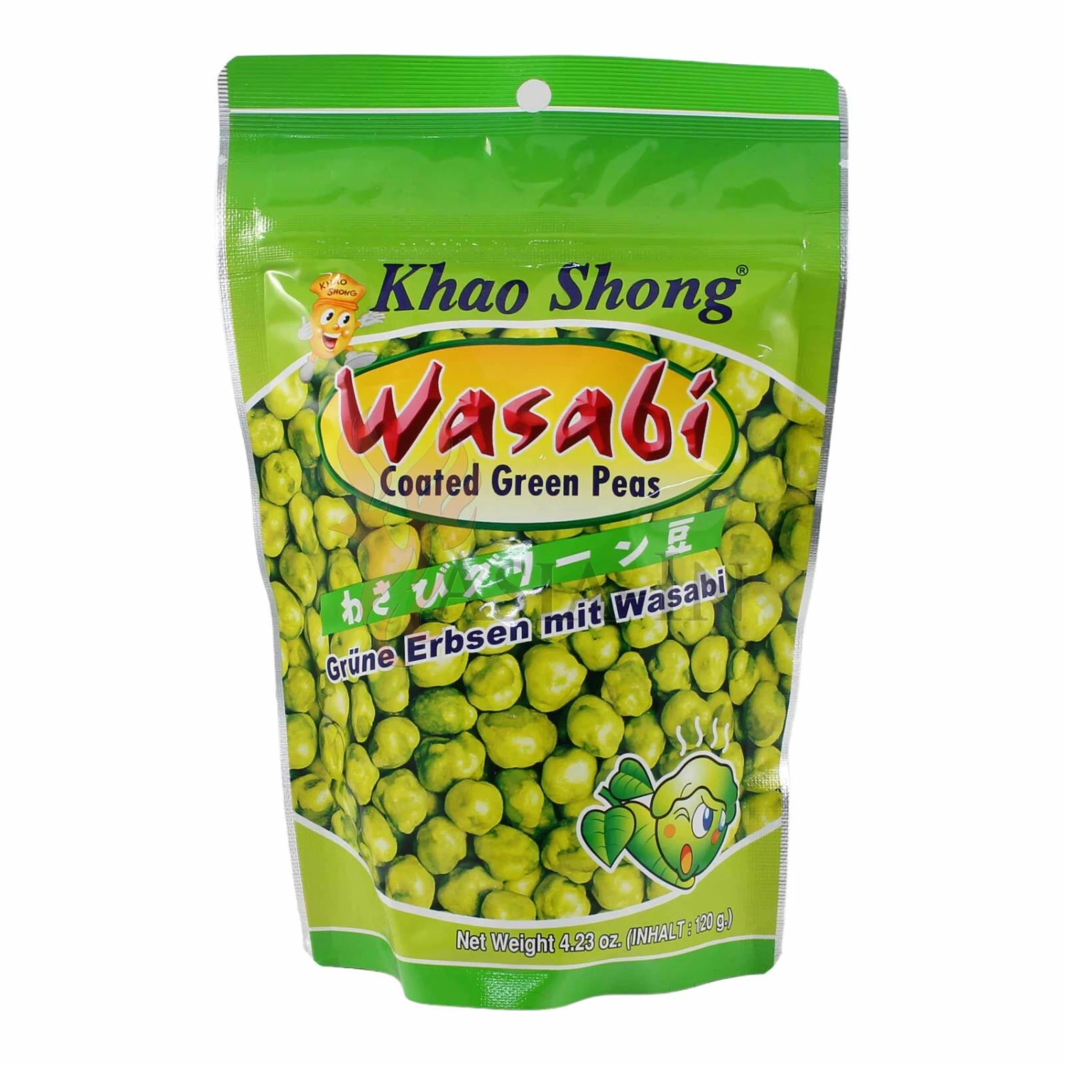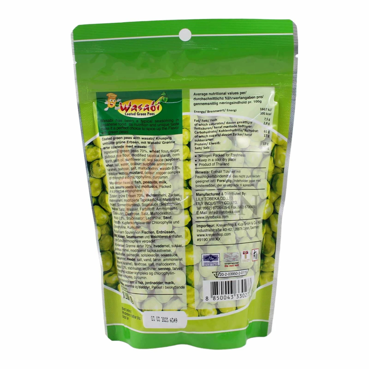 | Zutaten: | grüne Erbsen, 70%, Weizenmehl, Zucker, Klebreismehl, Modifizierte Tapiokastärke, Maisstärke, Palmöl, Sonnenblumenöl, Sojasauce (Sojabohnen, Weizenmehl, Salz, Wasser, Farbstoff: Ammoniumsulfit-Zuckerkulör E150d), Dextrose, Salz, Maltodextrin, Wasabi, 0,3%, Emulgator: Lecithin E322 (enhält Soja), Senf, Farbstoff: Kupferkomplexe der Chlorophylle E141, Kurkumin |