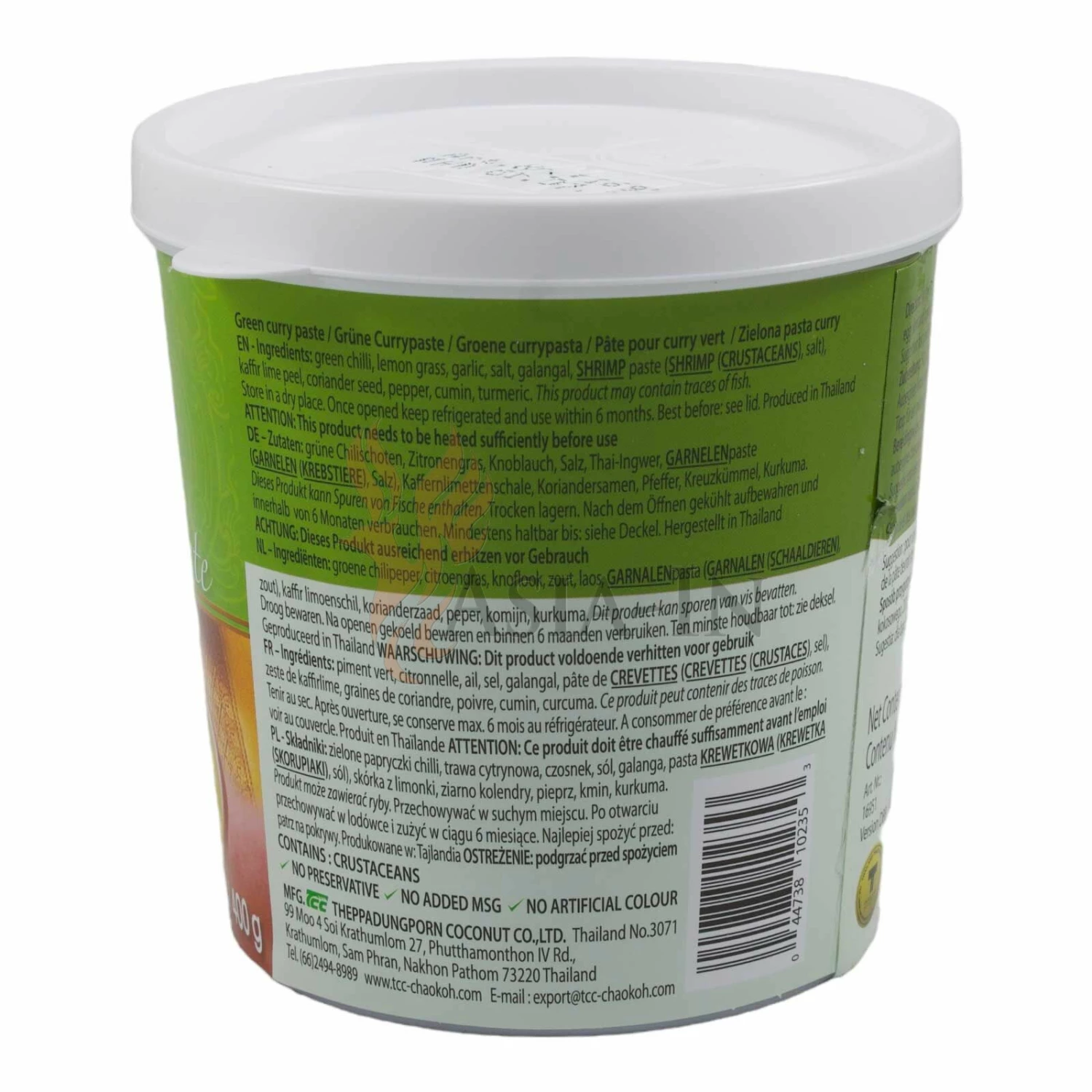 | Zutaten: | grüne Chilischoten, Zitronengras, Knoblauch, Salz, Galgant (Thai Ingwer), Garnelenpaste (Garnelen (Krebstiere), Salz), Kaffir-Limettenschale, Koriandersamen, Pfeffer, Kreuzkümmel, Kurkuma |