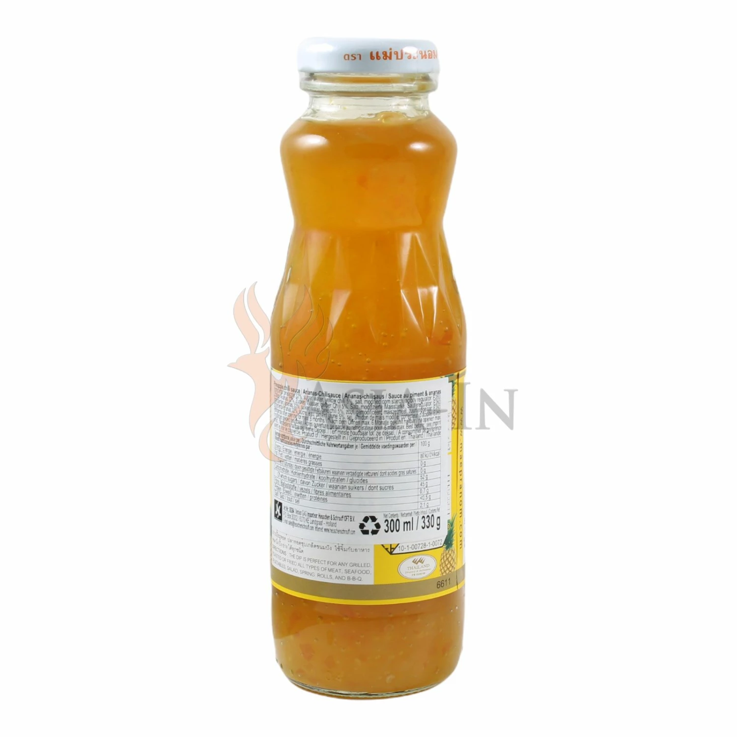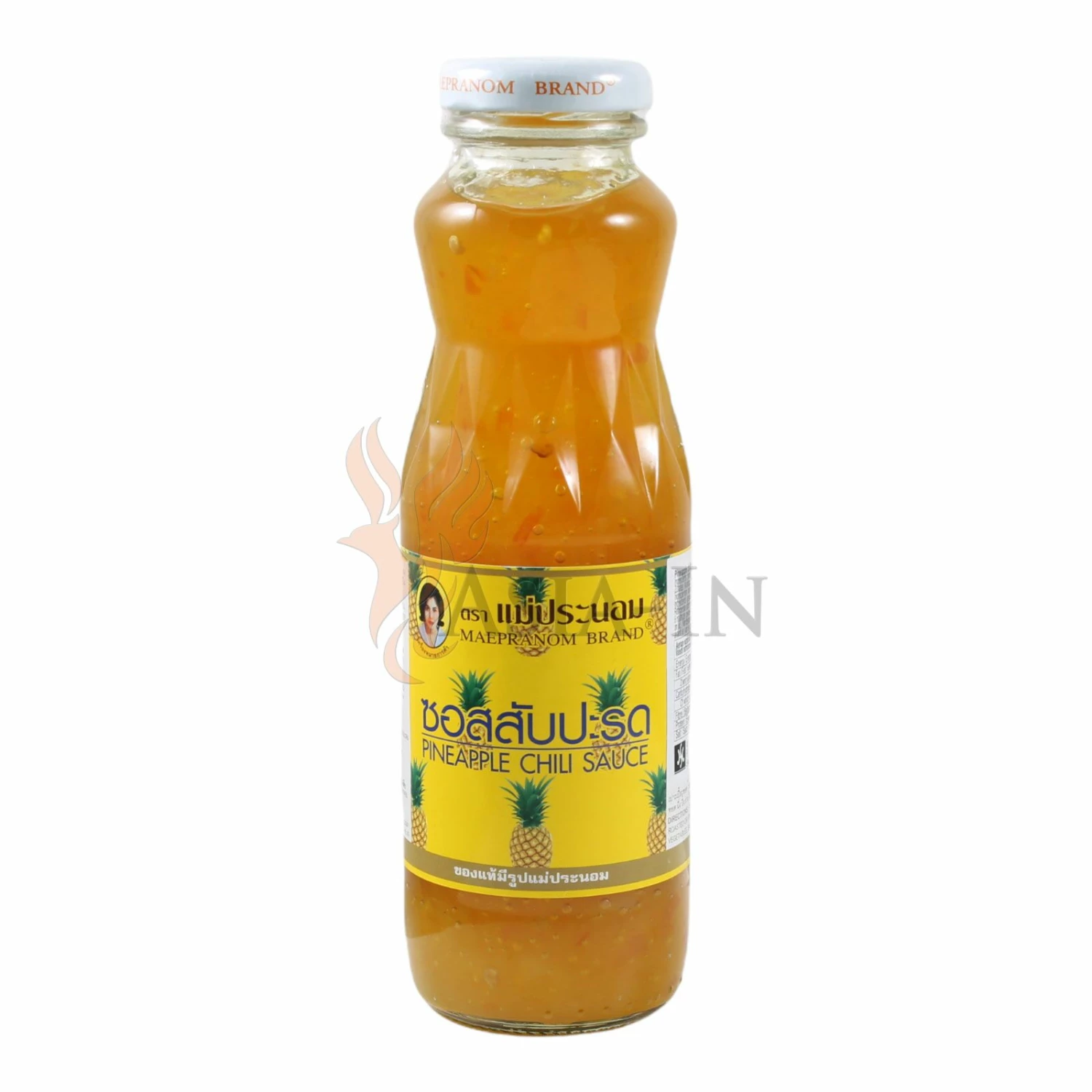 Wir von asia-in.de liefern die Ananas Chili Sauce in einer schönen Glasflasche mit einem attraktiven Label. Hersteller Mae Pranom, ein sehr großer Nahrungsmittelproduzent in Asien, produziert ausschließlich unter höchsten Qualitätsstandards. Das gilt auch für Zutaten, im Wesentlichen: Zucker 35%, Ananas 25%, Wasser 25%, 5% gelben Chili, Essig 5%, Salz 4%.