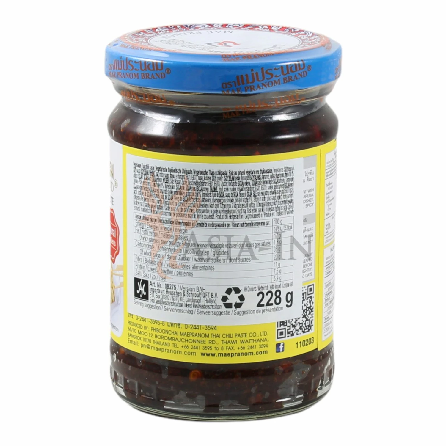 Die vegetarische Thai Chili Paste stammt aus dem bekannten Hause Mae Pranom, ein Hersteller, von dem wir auch noch zahlreiche weitere asiatische Zutaten anbieten. Vegetarische Thai Chili Paste besteht größtenteils aus Sojaprodukten, Gewürzen, Shitakepilzen, Chili-Schoten und einigen weiteren geschmackvollen Zutaten.