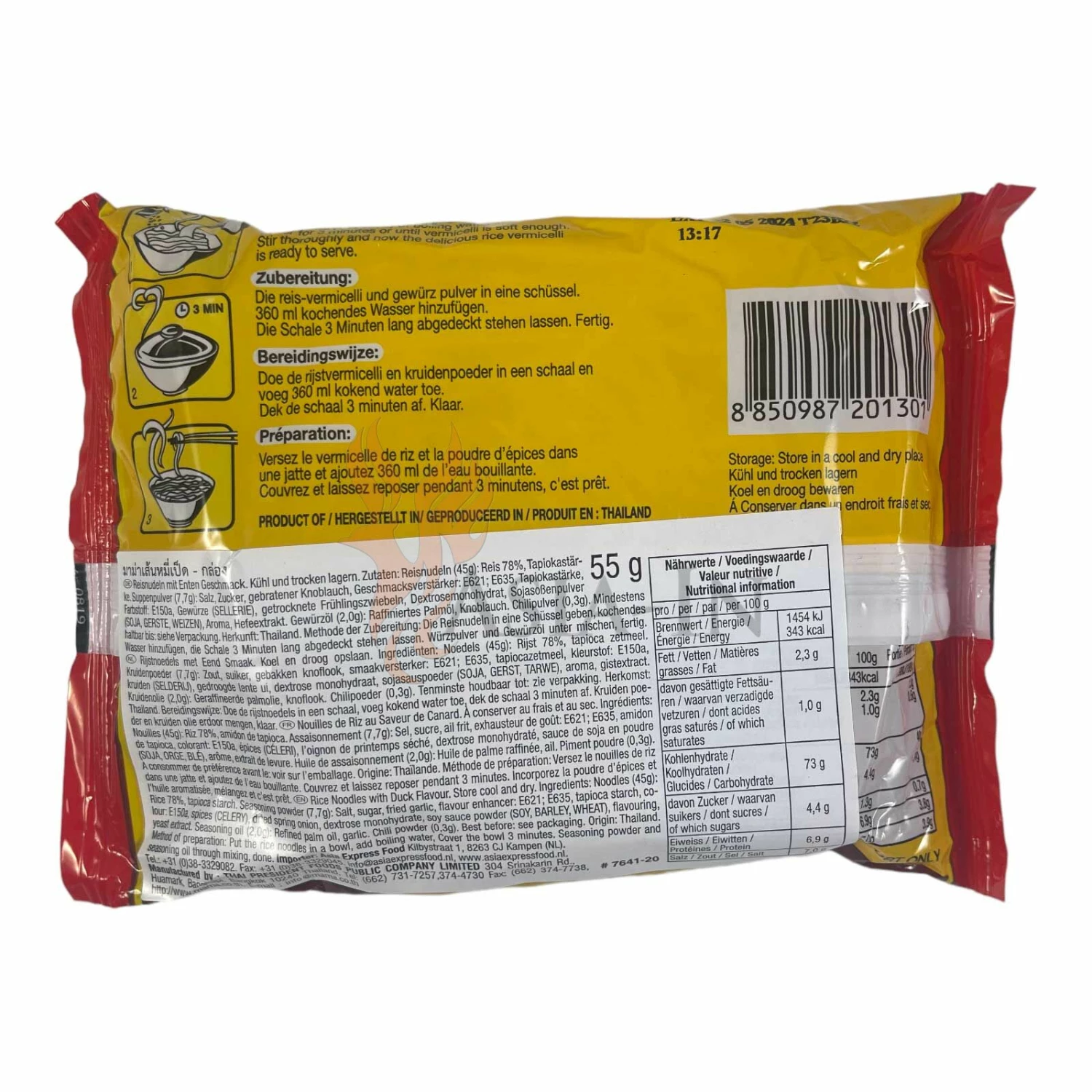 | Zutaten: | Nudeln: Reis, 78%, Tapiokastärke Würzmischung: Salz, Zucker, gebratener Knoblauch, Geschmacksverstärker: Mononatriumglutamat E621, Geschmacksverstärker: Dinatrium-5’-ribonucleotid E635, Tapiokastärke, Farbstoff: Zuckerkulör E150, Sellerie, getrocknete Frühlingszwiebeln, Dextrosemonohydrat, Sojasaucenpulver (Soja, Gerste, Weizen), Aroma, Hefeextrakt Öl: raffiniertes Palmöl, Knoblauch, Chilipulver |