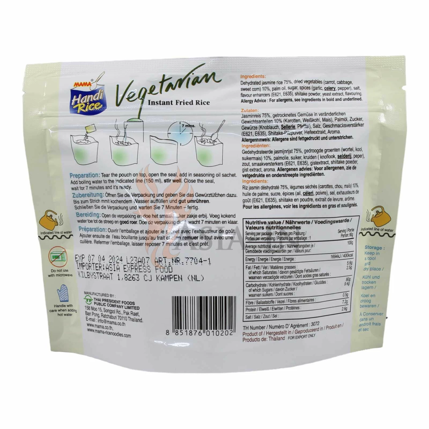 | Zutaten: | Jasminreis, getrocknetes Gemüse (Karotten, Weisskohl, Mais, Palmöl, Zucker, Gewürze (Knoblauch, Sellerie, Pfeffer), Salz, Geschmacksverstärker: Mononatriumglutamat E621, Geschmacksverstärker: Dinatrium-5’-ribonucleotid E635, Shiitake-Pilzpulver, Hefeextrakt, Aroma |