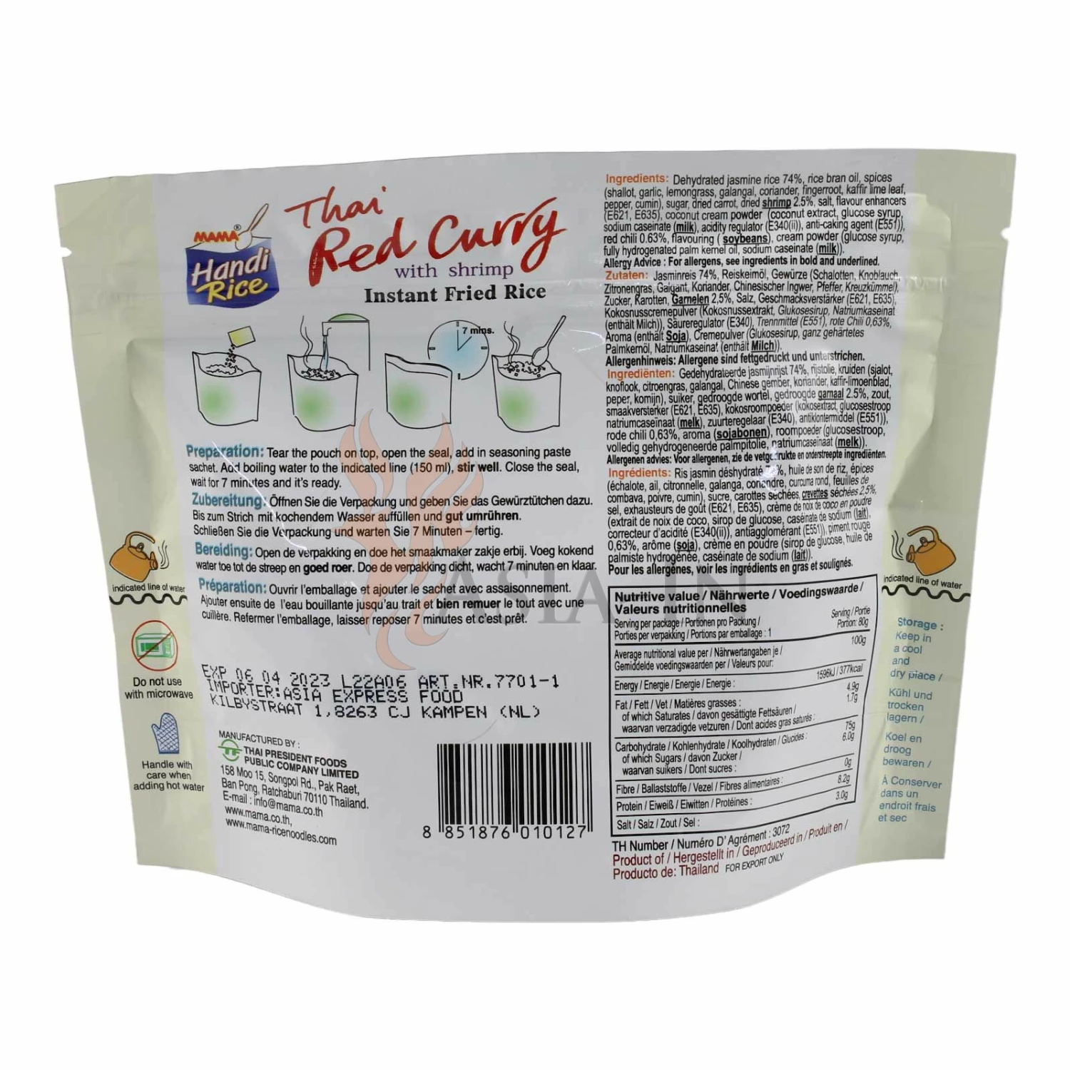 | Zutaten: | Jasminreis 74%, Reiskeimöl, Gewürze (Schalotten, Knoblauch, Zitronengras, Galgant (Thai Ingwer), Koriander, Ingwer, Pfeffer, Kreuzkümmel), Zucker, Karotten, Garnelen, 2,5%, Salz, Geschmacksverstärker: Mononatriumglutamat E621, Geschmacksverstärker: Dinatrium-5’-ribonucleotid E635, Kokosnusscremepulver (Kokosnussextrakt, Glucose-Sirup, Natriumkaseinat), Säureregulator: Kaliumphosphat E340, Trennmittel: Siliciumdioxid E551, rote Chilipulver, 0,63%, Aroma (enthält Soja), Cremepulver (Glucose-Sirup, Palmöl, Natriumkaseinat (enthält Milch), |