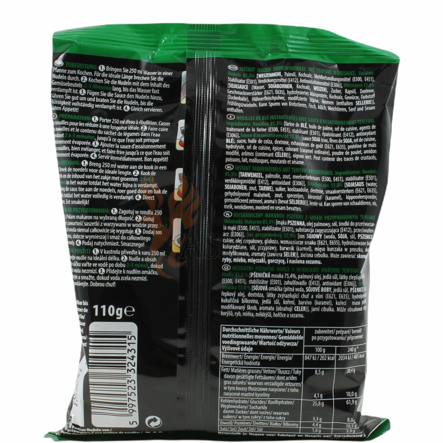| Zutaten: | Nudeln: Weizenmehl, Palmöl, Kochsalz, Mehlbehandlungsmittel (Backtriebmittel: Natriumcarbonate E500, Backtriebmittel: Triphosphat E451), Backtriebmittel: Kaliumcarbonate E501, Verdickungsmittel: Guarkernmehl E412, Antioxidationsmittel: Tocopherol E306 Würzmittel: Sojasauce (Wasser, Sojabohnen, Kochsalz, Weizen), Zucker, Rapsöl, Dextrose, Geschmacksverstärker: Mononatriumglutamat E621, Geschmacksverstärker: Dinatrium-5’-ribonucleotid E635, hydrolisiertes Maisprotein, Kochsalz, Gewürze, Farbstoff: Zuckerkulör E150, Hühnerfleischpulver, Modifizierte Stärke, Aromen (enthält Sellerie), Frühlingszwiebeln |