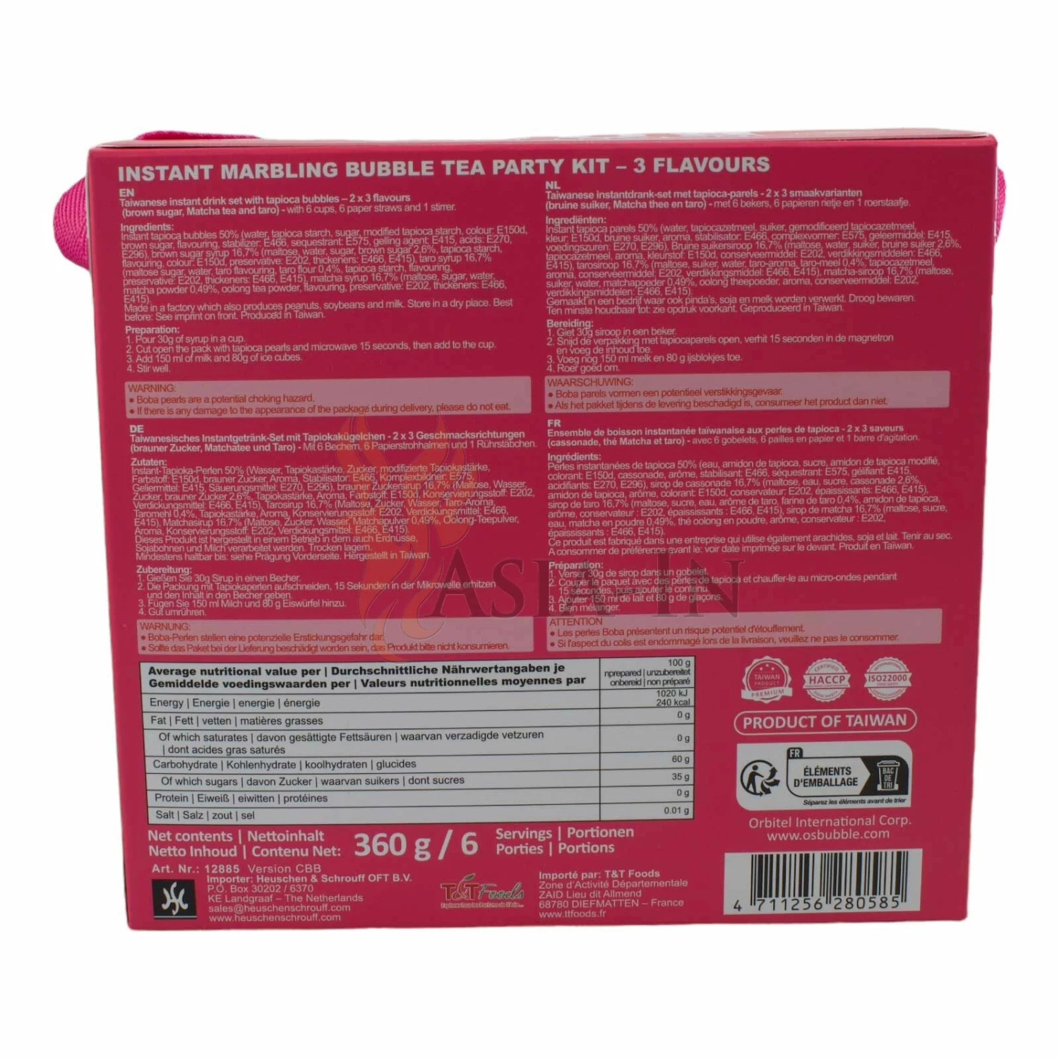 | Zutaten: | Tapiokaperlen: Wasser, Tapiokastärke, Zucker, Modifizierte Tapiokastärke, Farbstoff: Ammoniumsulfit-Zuckerkulör E150d, brauner Zucker, Aroma, Verdickungsmittel: Natrium-Carboxymethylcellulose E466, Säuerungsmittel: Glucono-delta-lacton E575, Verdickungsmittel: Xanthan E415, Säuerungsmittel: Milchsäure E270, Säuerungsmittel: Apfelsäure E296Sirup: Maltose, Wasser, Zucker, brauner Zucker, 3%, Tapiokastärke, Aroma, Farbstoff: Ammoniumsulfit-Zuckerkulör E150d, Konservierungsstoff: Kaliumsorbat E202, Verdickungsmittel: Natrium-Carboxymethylcellulose E466, Verdickungsmittel: Xanthan E415, Tarosirup, 16,7% (Maltose, Wasser, Taro Aroma, Taromehl, 0,4%, Tapiokastärke, Aroma, Konservierungsstoff: Kaliumsorbat E202, Verdickungsmittel: Natrium-Carboxymethylcellulose E466, Verdickungsmittel: Xanthan E415, Matchasirup, 16,7% (Maltose, Zucker, Matcha-Pulver, 0,49%, Oolong Teepulver, Aroma, Konservierungsstoff: Kaliumsorbat E202, Verdickungsmittel: Natrium-Carboxymethylcellulose E466, Verdickungsmittel: Xanthan E415 |