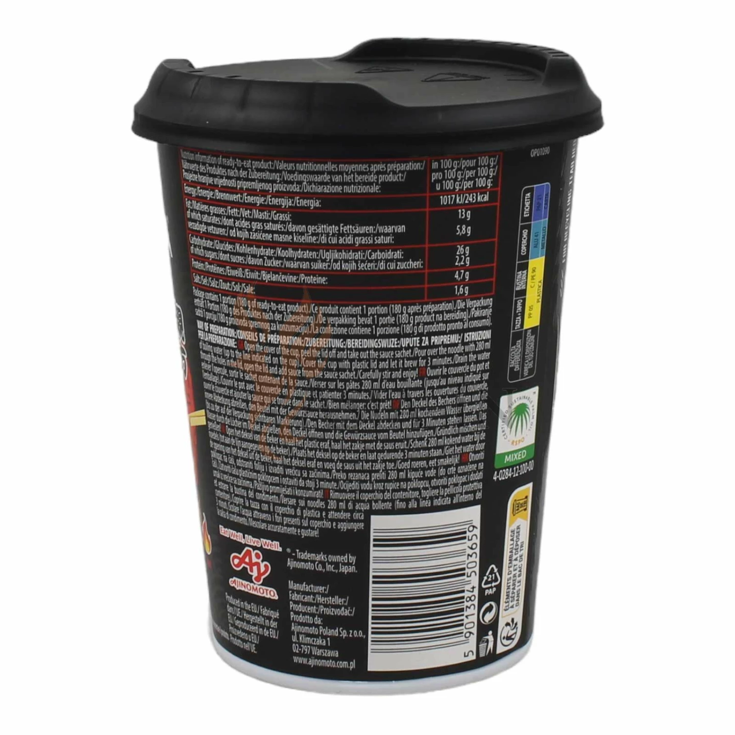 | Zutaten: | Nudeln: (Weizenmehl, Palmöl, Modifizierte Stärke, Salz, Backtriebmittel: Natriumcarbonate E500, Backtriebmittel: Kaliumcarbonate E501)Sauce: (Sojasauce (Wasser, Sojabohnen, Weizen, Salz), Pflanzenöl (Sonnenblumenöl, Raps), Zucker, Geschmacksverstärker: Mononatriumglutamat E621, Geschmacksverstärker: Dinatrium-5’-ribonucleotid E635, Gewürze:, Meerrettich, Ingwer, schwarzer Pfeffer, Piment, Aromen, Zwiebeln, Laktose, Hefeextrakt, Säureregulator, Säuerungsmittel: Milchsäure E270, Würzmischung ( Gemüse: Zwiebeln, Karotten, Sellerie, Sonnenblumenöl, Zwiebeln, Zucker, Maisstärke, Salz, Knoblauch, schwarzer Pfeffer), Schnittlauch, Karotten, Rindfleischstücke |