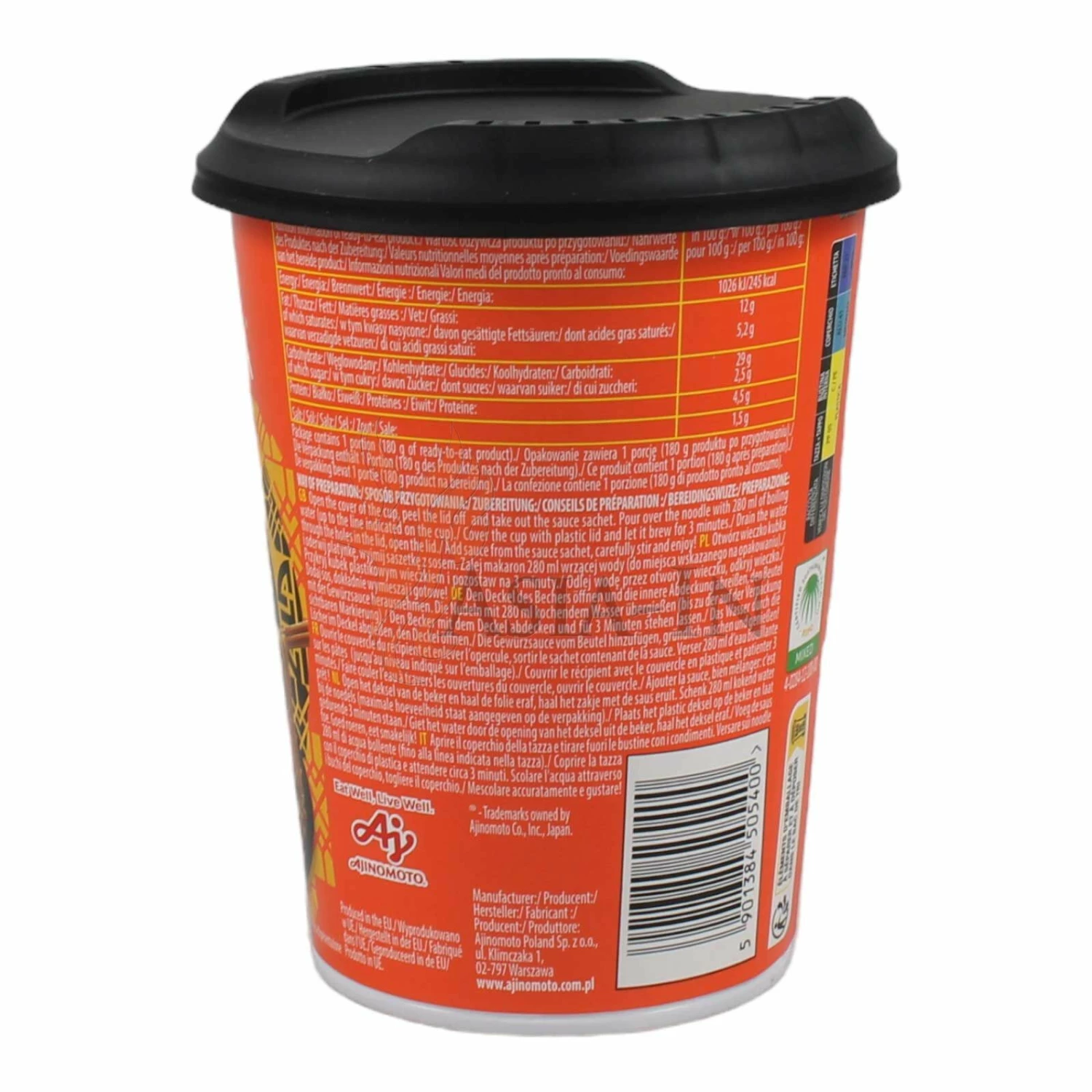 | Zutaten: | Nudeln: (Weizenmehl, Palmöl, Modifizierte Stärke, Salz, Backtriebmittel: Natriumcarbonate E500, Backtriebmittel: Kaliumcarbonate E501)Sauce: (Sojasauce (Wasser, Sojabohnen, Weizen, Salz), Zucker, Pflanzenöl (Sonnenblumenöl, Raps), Zucker, Geschmacksverstärker: Mononatriumglutamat E621, Geschmacksverstärker: Dinatrium-5’-ribonucleotid E635, hydrolisiertes Maisprotein, Sesamöl, Aromen (enthält Milch), Maltodextrin, karamellisierter, Zucker, Hefeextrakt, Salz, Chili, Bratzwiebelsaftpulver (Zwiebelsaft, Maltodextrin, Sonnenblumenöl), Karotten, Lauch, Chili |