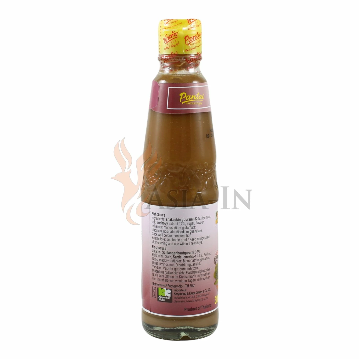| Zutaten: | eingelegte Gourami, 80% (Gourami, Salz, Reispulver, Fischsauce), Fischsauce, 20% (Sardellen, Salz, Zucker), Geschmacksverstärker: Mononatriumglutamat E621 |