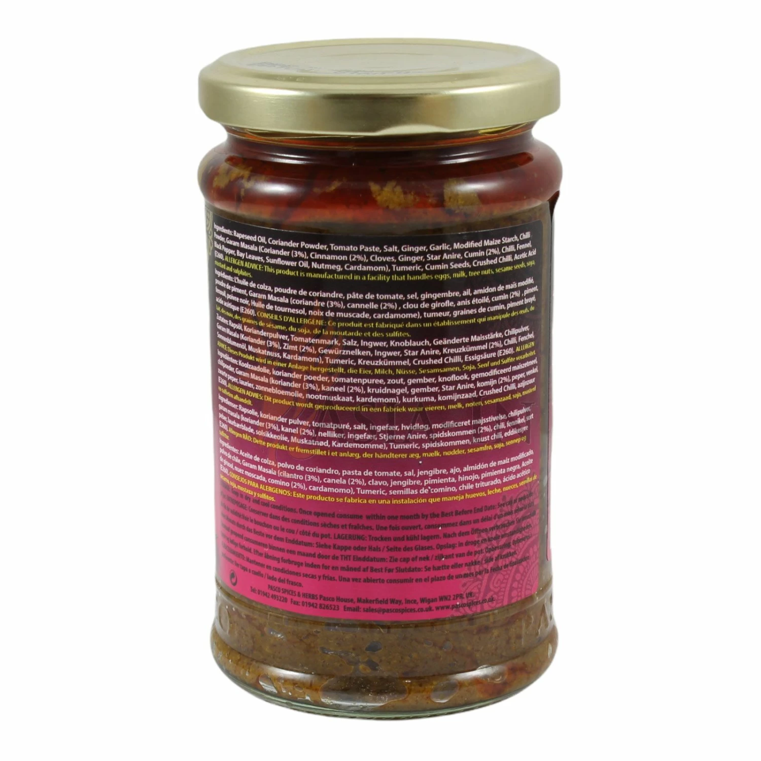 | Zutaten: | Rapsöl, Korianderpulver, Tomatenmark, Salz, Ingwer, Knoblauch, Modifizierte Maisstärke, Chilipulver, Garam Masala (Koriander, 3%, Zimt, 2%, Gewürznelken, Ingwer, Sternanis, Kreuzkümmel, 2%, Chili, Fenchel, Sonnenblumenöl, Muskatnuss, Kardamom), Kurkuma, Kreuzkümmel, zerkleinerte, Chilis, Säuerungsmittel: Essigsäure E260 |