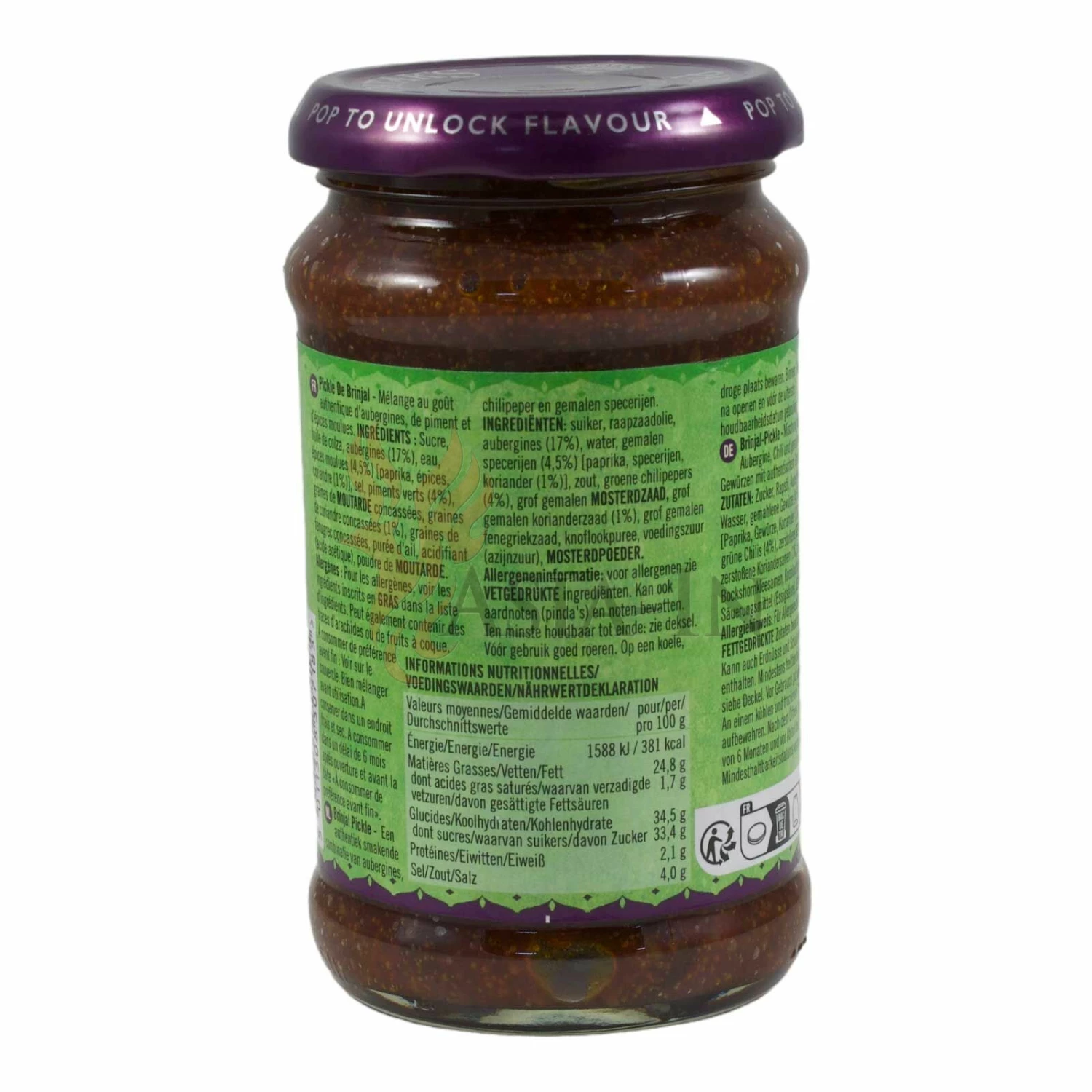 | Zutaten: | Zucker, Rapsöl, Auberginen, 17%, Wasser, Gemahlene, Gewürze, 4,5% (Paprika, Gewürze, Koriander, 1%), Salz, grüne Chilis, 4%, Senfsamen, Koriandersamen, 1%, Bockshornkleesamen, Knoblauchpüree, Säuerungsmittel: Essigsäure E260, Senfpulver |