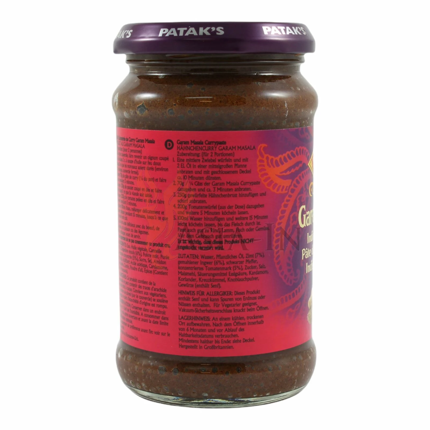 Die Garam Masala Paste von Patak´s ist eine milde, tabakfarbige Würzmischung. Es enthält Koriander, Knoblauch, Ingwer und Zimt. Mit der Zugabe von schwarzem Pfeffer wird der Garam Masala Paste die milde Schärfe beigefügt und das Tomatenmark gibt ihr eine fruchtige Note und rundet die Würzpaste geschmacklich ab.