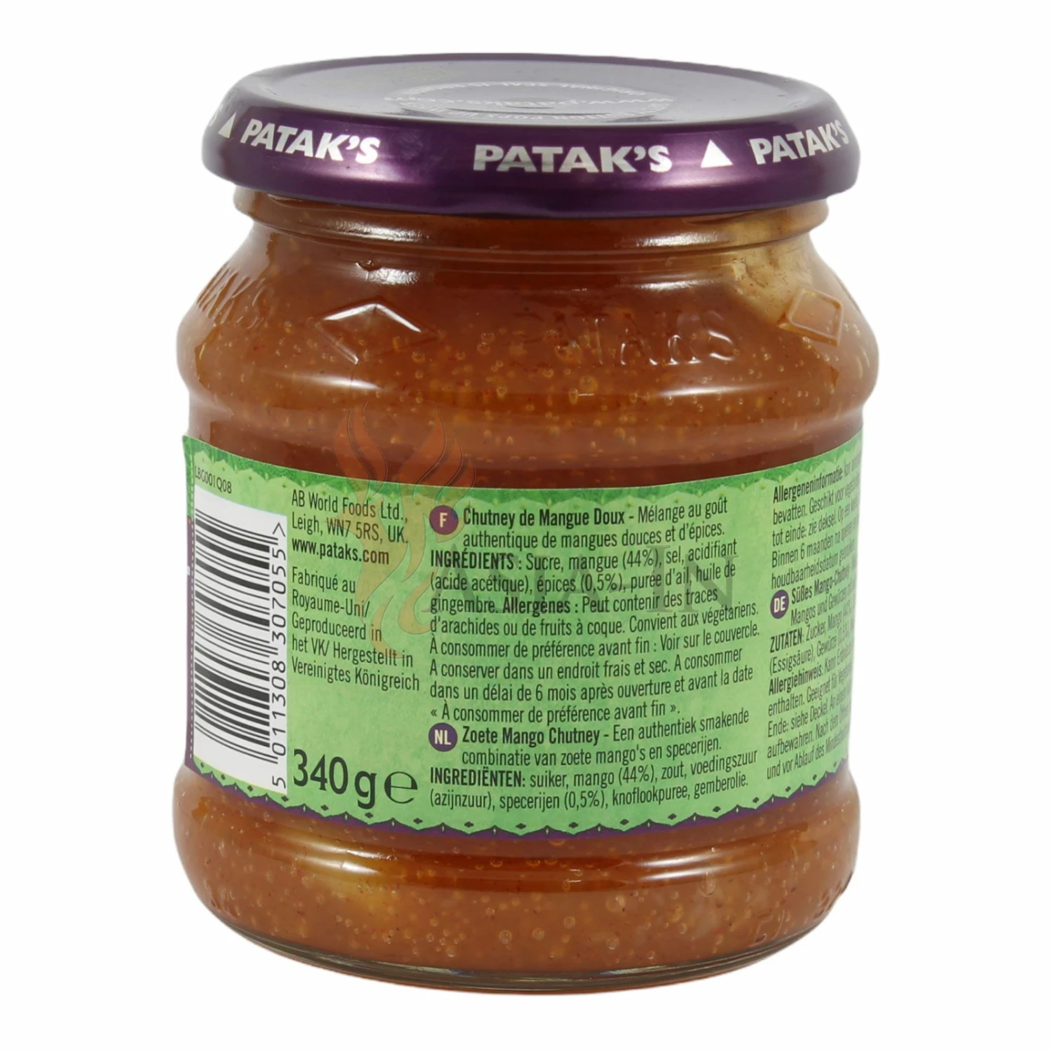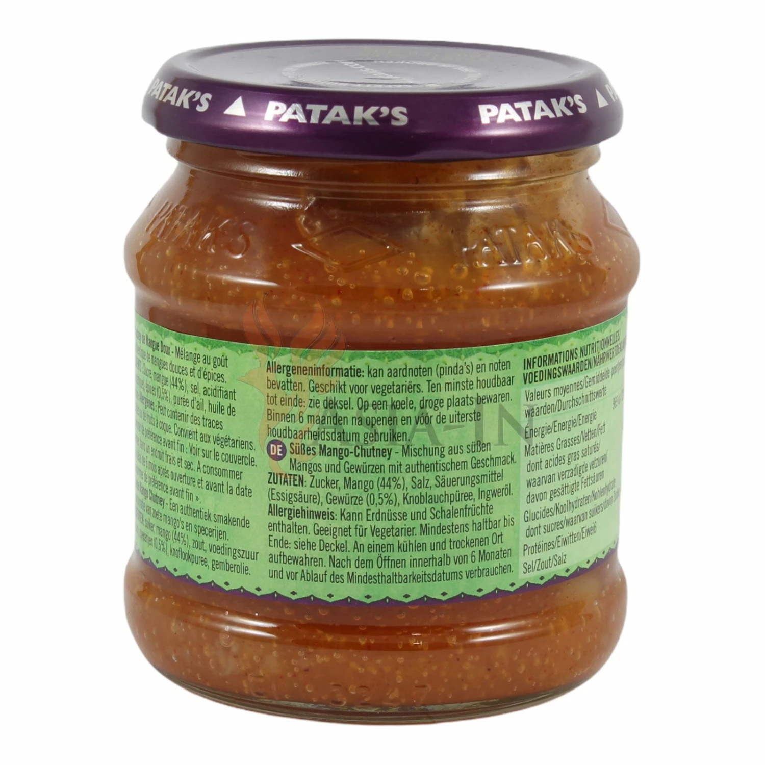 | Zutaten: | Zucker, Mango, 44%, Salz, Säuerungsmittel: Essigsäure E260, Gewürze, 0,5%, Knoblauchpüree, Ingweröl |