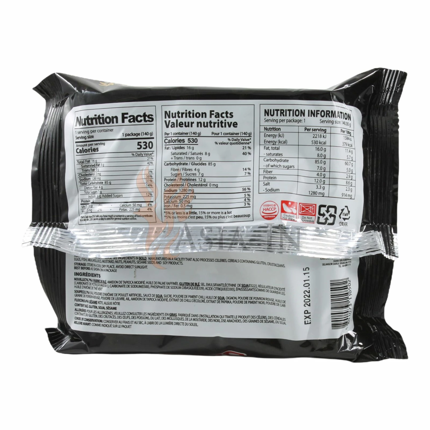| Zutaten: | Nudeln: Weizenmehl, Modifizierte Tapiokastärke, raffiniertes Palmöl, Weizengluten, Salz, Emulgator: Lecithin E322 (enhält Soja), Säuerungsmittel: Kaliumcarbonate E501, Säuerungsmittel: Natriumcarbonate E500, Säureregulator: Natriumphosphat E339, Säuerungsmittel: Citronensäure E330, Verdickungsmittel: Guarkernmehl E412, Grüner Tee Aromaöl Würzmischung: Wasser, künstliches, Huhnaroma, Sojasauce, Zucker, Chilipfefferpulver, rotes Chilisamenöl, Hefepulver, Knoblauch, Modifizierte Kartoffelstärke, entfärbtes Chiliextrakt, Paprika, schwarzes Pfefferpulver, Currypulver Flocken: gerösteter Sesam, Laver |