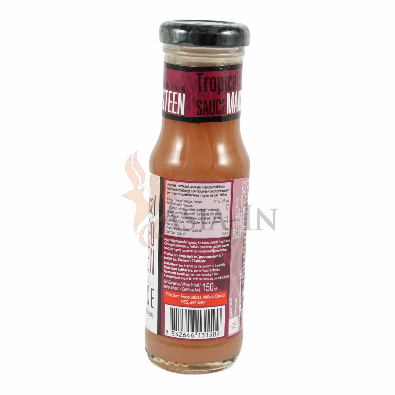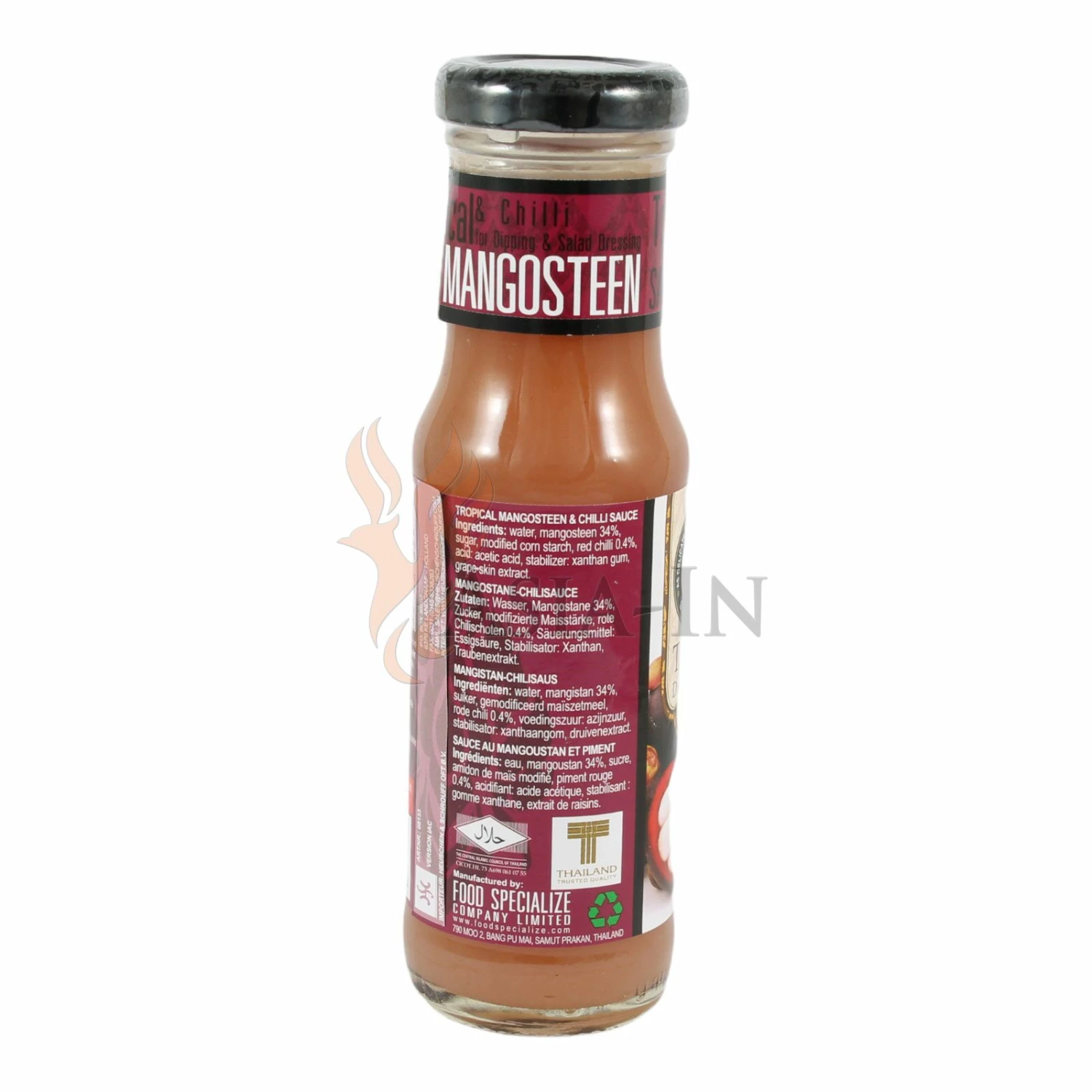 | Zutaten: | Wasser, Mangosteen, 34%, Zucker, Modifizierte Maisstärke, rote Chilischoten, 0,4%, Säuerungsmittel: Essigsäure E260, Verdickungsmittel: Xanthan E415, Traubenextrakt |