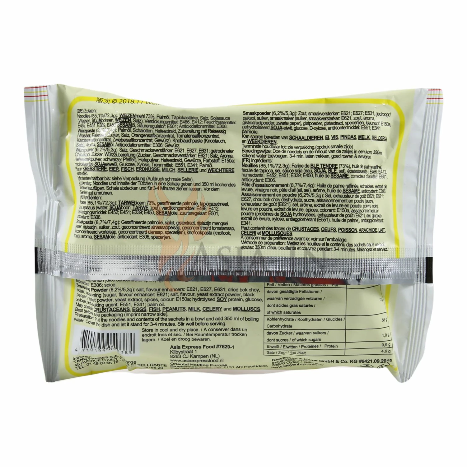 | Zutaten: | Weizenmehl 70%, Palmöl, Tapiokastärke, Salz, Sojasauce (Sojabohnen, Weizen, Wasser, Salz), Verdickungsmittel: Natrium-Carboxymethylcellulose E466, Verdickungsmittel: Guarkernmehl E412, Sesamöl, Säuerungsmittel: Kaliumcarbonate E501, Säureregulator: Polyphosphate E452, Backtriebmittel: Triphosphat E451, Säureregulator: Natriumphosphat E339, Backtriebmittel: Diphosphate E450, Antioxidationsmittel: Tocopherol E306, Farbstoff: Beta-Carotin E160a Würzmischung: Palmöl, Schalotten, 19,6%, Knoblauchpüree, Sesamöl, Antioxidationsmittel: Tocopherol E306, Zimtpulver Würzmischung: Salz, Geschmacksverstärker: Mononatriumglutamat E621, getrockneter Pak Choi, Gewürze (schwarzer Pfeffer, Chilipulver, Sternanispulver), Geschmacksverstärker: Dinatriuminosinat E631, Geschmacksverstärker: Dinatriumguanylat E627, Hefeextrakt, Würze (Dextrine, Zucker, Säureregulator: Natriumacetat E262, Säuerungsmittel: Essigsäure E260), Pfeffer, Zimt, Kardamom, Nelken, Knoblauch, Weizen), Farbstoff: Zuckerkulör E150, Säureregulator: Calciumphosphat E341, Hefeextrakt |