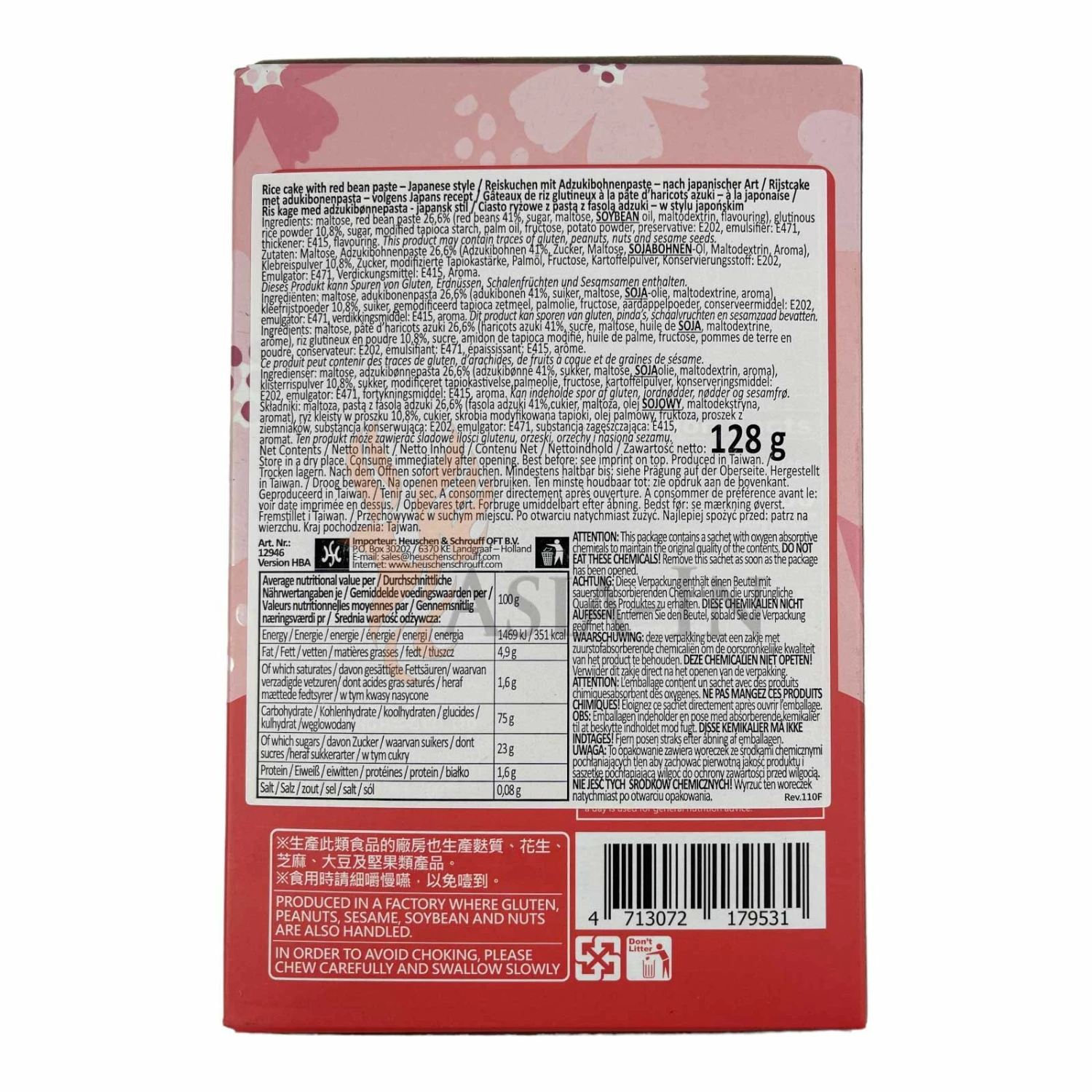 | Zutaten: | Maltose, Adzukibohnenpaste, 26,6% (Adzukibohnen, 41%, Zucker, Maltose, Sojaöl, Maltodextrin, Aroma), Klebreispulver, 10,8%, Zucker, Modifizierte Tapiokastärke, Palmöl, Fructose, Kartoffelpulver, Konservierungsstoff: Kaliumsorbat E202, Emulgator: Mono- und Diglyceride von Speisefettsäuren E471, Verdickungsmittel: Xanthan E415, Aroma |
