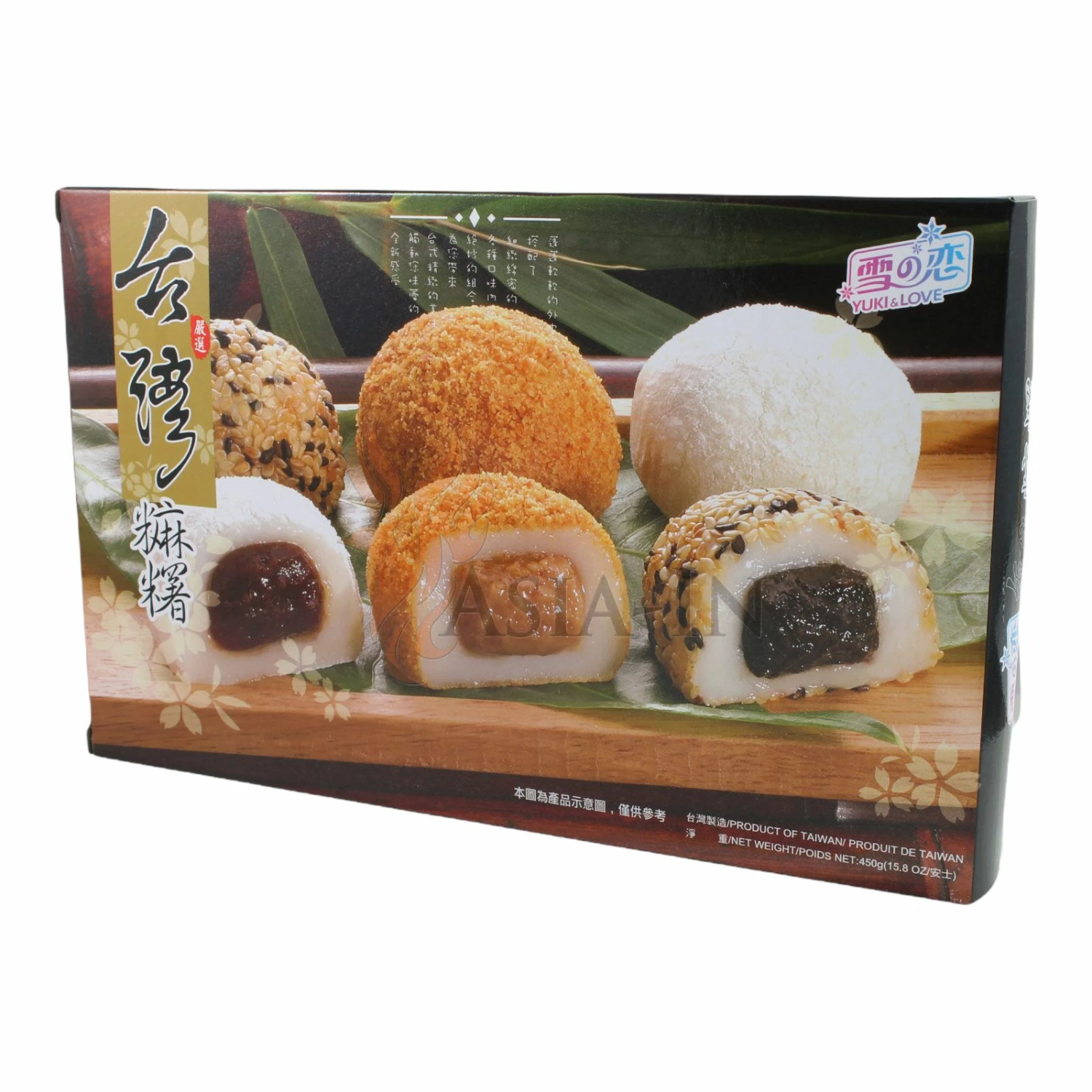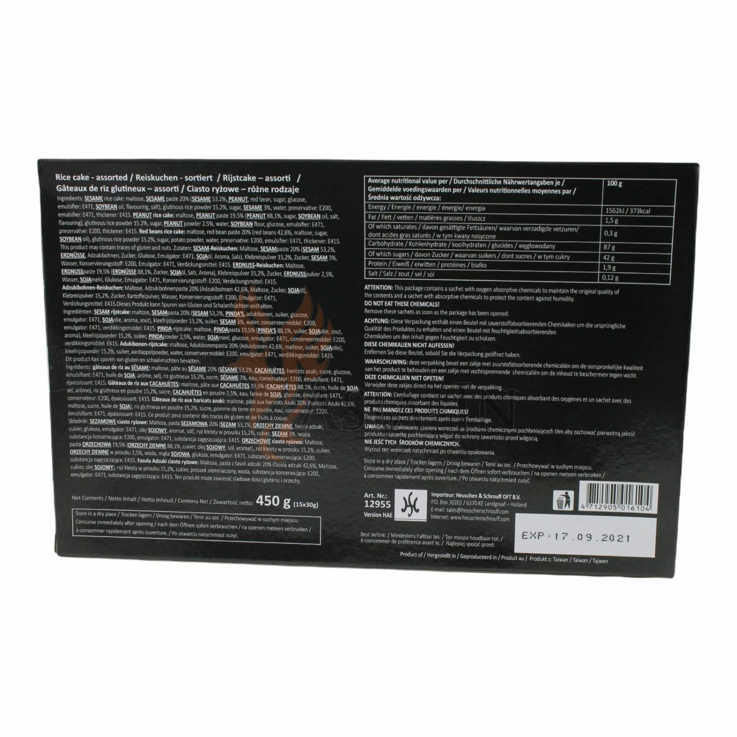 | Zutaten: | Sesam Mochi: Maltose, Sesampaste, 20% (Sesam, 53,2%, Erdnüsse, Adzukibohnen, Zucker, Glucose, Emulgator: Mono- und Diglyceride von Speisefettsäuren E471, Sojaöl, Salz, Sesamaroma), Klebreispulver, 15,2%, Zucker, Sesam, 3%, Wasser, Konservierungsstoff: Sorbinsäure E200, Emulgator: Mono- und Diglyceride von Speisefettsäuren E471, Verdickungsmittel: Xanthan E415 Erdnuss Mochi: Maltose, Erdnusspaste, 19,5% (Erdnüsse, 88,1%, Zucker, Sojaöl, Salz, Erdnussaroma), Klebreispulver, 15,2%, Zucker, Erdnusspulver, 2,5%, Wasser, Sojamehl, Glucose, Emulgator: Mono- und Diglyceride von Speisefettsäuren E471, Konservierungsstoff: Sorbinsäure E200, Emulgator: Mono- und Diglyceride von Speisefettsäuren E471 Adzuki Mochi: Maltose, Adzukibohnenpaste, 20% (Adzukibohnen, 42,6%, Maltose, Zucker, Sojaöl), Klebreispulver, 15,2%, Zucker, Kartoffelpulver, Wasser, Konservierungsstoff: Sorbinsäure E200, Emulgator: Mono- und Diglyceride von Speisefettsäuren E471, Verdickungsmittel: Xanthan E415 |