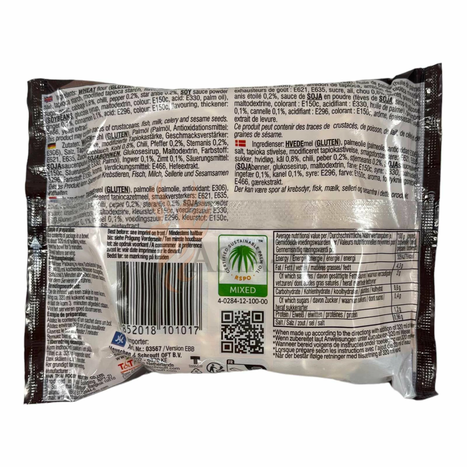 | Zutaten: | Weizenmehl, Palmöl (enthält Antioxidationsmittel: Tocopherol E306), Salz, Tapiokastärke, Knoblauch, 0,8%, Geschmacksverstärker: Mononatriumglutamat E621, Geschmacksverstärker: Dinatrium-5’-ribonucleotid E635, Zucker, Chili, Pfeffer, 0,2%, Sternanis, 0,2%, Sojasaucenpulver, Sojabohnen, Glucose-Sirup, Maltodextrin, Farbstoff: Ammoniak-Zuckerkulör E150c, Säuerungsmittel: Citronensäure E330, Ingwer, 0,1%, Zimt, 0,1%, Säuerungsmittel: Apfelsäure E296, Aroma, Verdickungsmittel: Natrium-Carboxymethylcellulose E466, Hefeextrakt, Maltodextrin, Farbstoff: Ammoniak-Zuckerkulör E150c, Säuerungsmittel: Citronensäure E330, Palmöl), Säuerungsmittel: Natriumcarbonate E500, Säureregulator: Polyphosphate E452, Säureregulator: Triphosphat E451, Säuerungsmittel: Apfelsäure E296, Farbstoff: Ammoniak-Zuckerkulör E150c, Aroma, Verdickungsmittel: Natrium-Carboxymethylcellulose E466, Hefeextrakt |